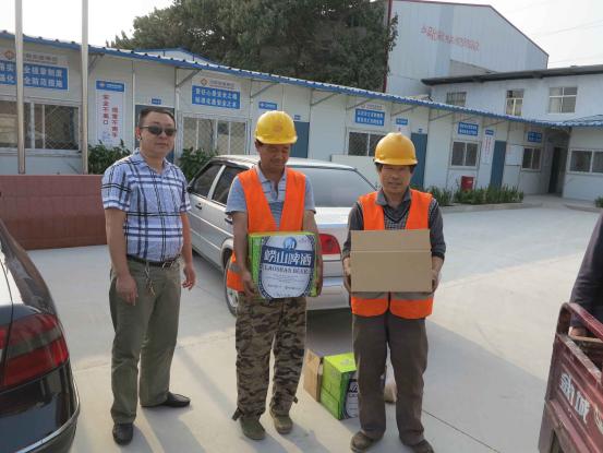 公司為農民工隊伍送去了大米、精肉、月餅、酒等節假日用品