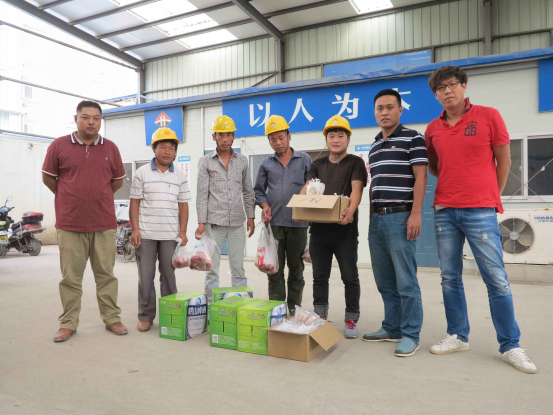公司為農民工隊伍送去了大米、精肉、月餅、酒等節假日用品