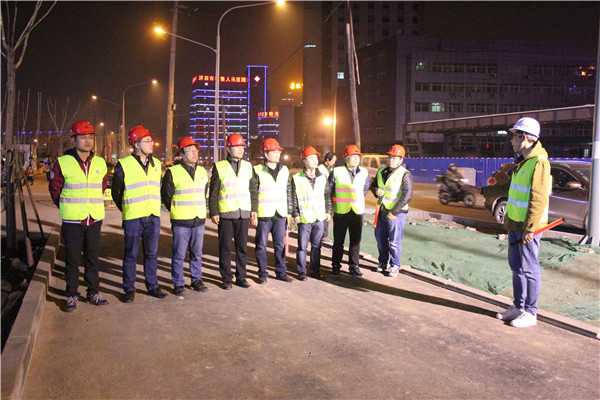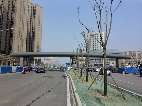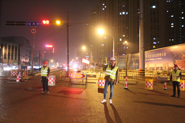 為保證吊裝工作順利進行,濟南市市政工程有限公司項目部提前策劃,與交警等相關部門充分溝通確定交通組織方案,建立吊裝安全保障小組并明確人員分工;同時為保證后續施工道路交通安全,濟南市市政工程有限公司項目部在南北兩側設立了臨時限高桿。3月16日晚11時現場正式封閉西半幅快車道吊裝西段主梁,在東半幅快車道中間進行隔離,南行及北行車輛分車道行駛,盧浮公館小區東門與緯十二路交叉口在西側箱梁吊裝期間進行封閉,車輛及行人繞行小區西門或南門。西段主梁吊裝完成后封閉東半幅快車道,吊裝東段主梁。濟南市市政工程有限公司于3月17日凌晨4時完成經五路人行天橋主箱梁吊裝施工。